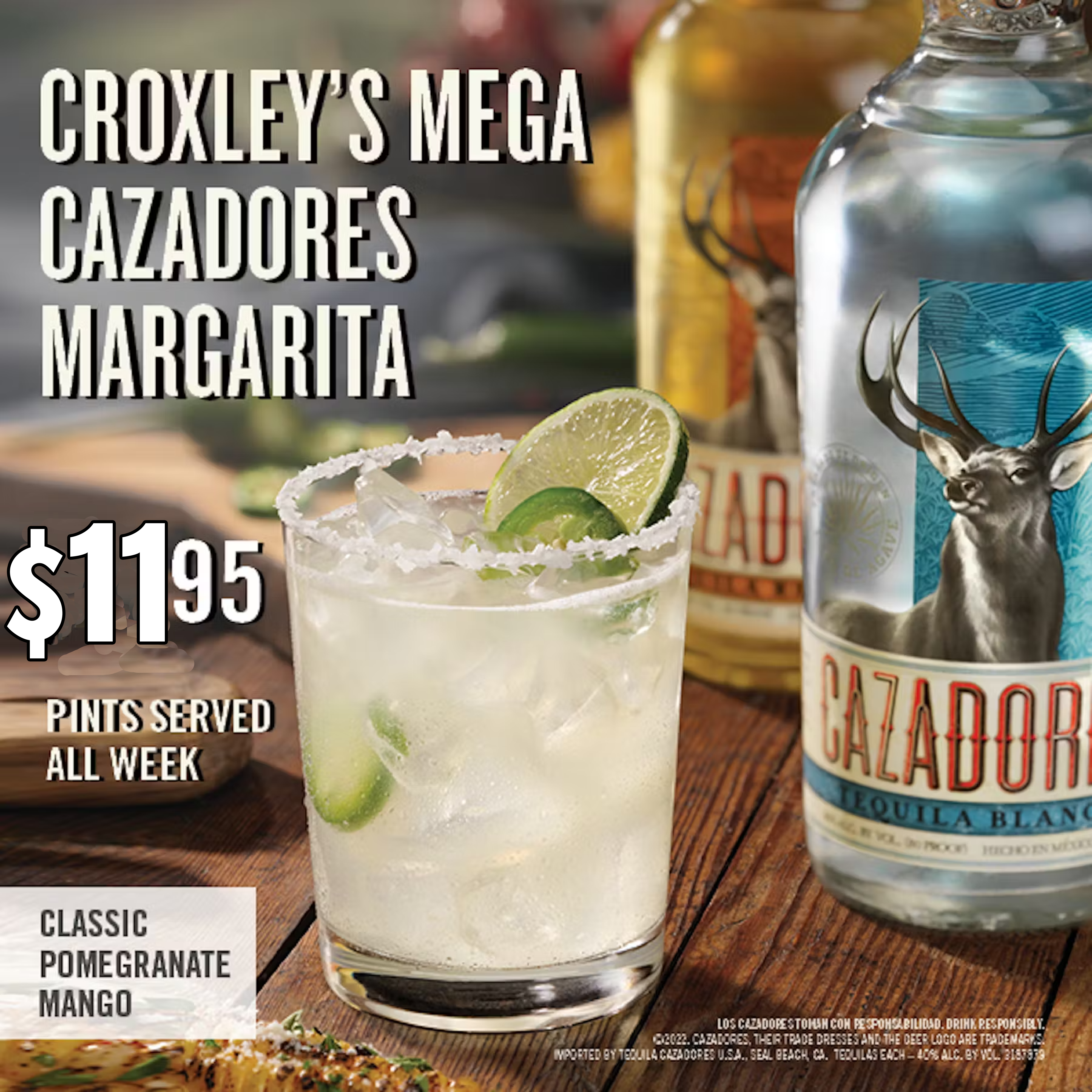 Mega Margaritas $11.95 Enjoy $11.95 pints of Cazadores Margaritas All Week!- Classic- Pomegranate- Mango